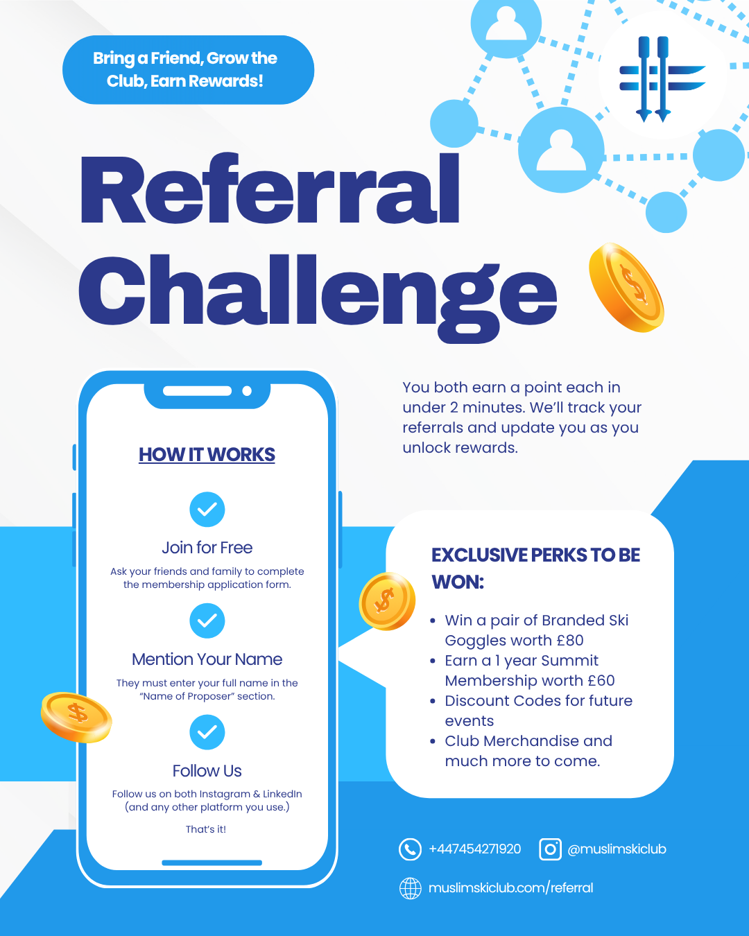 The Muslim Ski Club Referral Programme is your chance to help our community expand while earning some exclusive rewards along the way. Whether it’s a friend, family member, or colleague who’s been curious about skiing - now’s the perfect time to get them involved.
